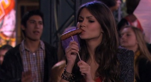Teen Nickelodeon slut Victoria Justice provocatively eats as sausage, or as they say in England “takes a banger in the mouth”, in the disturbing photo above.