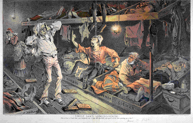 Uncle Sam’s Lodging House (1882) – Of all the immigrants, only the Irishman is causing trouble. Even the “Negro” is getting along with everyone, and something tells me “Negroes” weren’t all that popular in 1882.